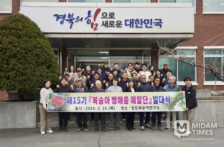 미담타임스 김준완 기자 | 경상북도농업기술원은 26일 청도복숭아연구소에서 복숭아 주산지 10개 시군(청도, 영천, 경산 등)에서 선발된‘2026년 복숭아 병해충 예찰단’ 발대식을 열고 본격 활동에 들어간다고 밝혔다.