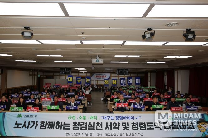 미담타임스 전해찬 기자 | 대구광역시는 2월 26일 ‘노사가 협력해 공직을 혁신한다’는 목표 아래 공직사회 청렴문화 확산과 실천 의지를 표명하기 위해, 대구공무원노동조합과 공동으로 ‘노사가 함께하는 청렴실천 서약 및 청렴도약 다짐대회’를 개최했다.