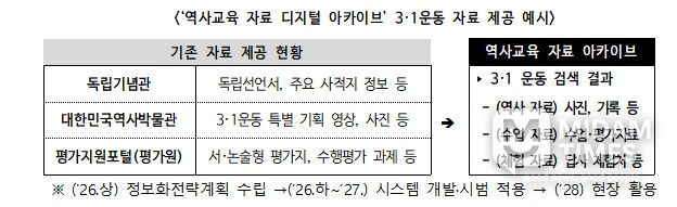 또한, 학생의 탐구 역량을 키우는 역사 수업 활성화를 위해 ‘탐구 중심 역사 교육과정 운영 사례집’(’26. 3종→’27. 9종)을 개발·보급한다. 더불어, 각종 기관·누리집(플랫폼) 등에 분산된 근현대 사료와 교육자료, 체험 자료 등을 수업에 즉시 활용할 수 있도록 교사에게 묶음(패키지) 형태로 제공하는 ‘역사교육 자료 아카이브’를 구축(ʹ27)할 예정이다.