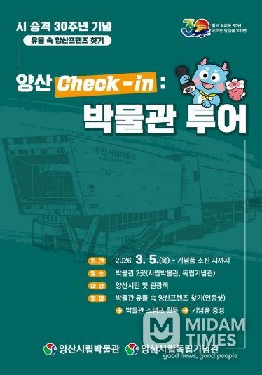 미담타임스 황명수 기자 | 양산시립박물관(관장 신용철)은 시 승격 30주년 및 양산 방문의 해를 맞아 3월 5일부터 양산시민 및 관광객을 대상으로 박물관 투어 특별 이벤트를 운영한다고 밝혔다.