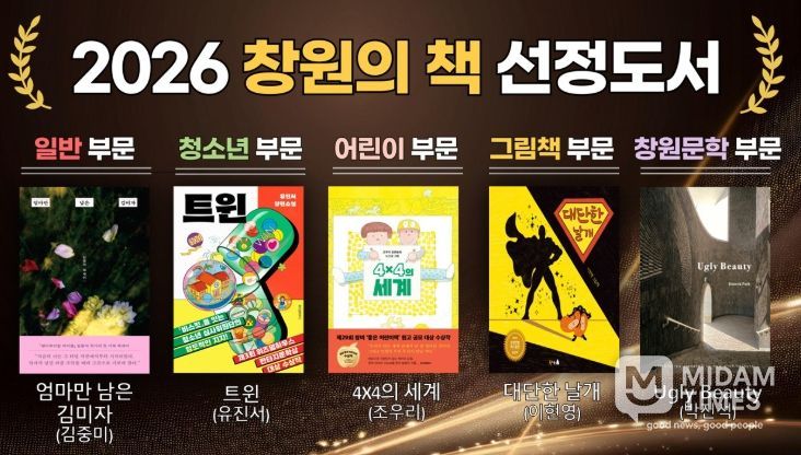 선정된 도서는 △ 일반 부문 : 엄마만 남은 김미자(김중미/사계절) △ 청소년 부문 : 트윈(유진서/위즈덤하우스) △ 어린이 부문 : 4X4의 세계(조우리/창비) △ 그림책 부문 : 대단한 날개(이현영/북극곰) △ 창원문학 부문 : Ugly Beauty(박진석/문장)이다.