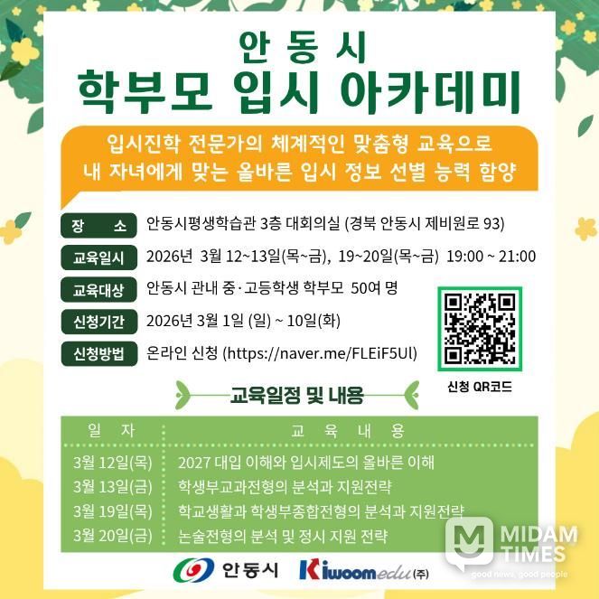 안동시 관계자는 “입시는 장기적인 준비가 필요한 만큼 학부모의 이해와 역할이 매우 중요하다”며 “이번 아카데미가 자녀의 미래 설계를 위한 든든한 길잡이가 되길 기대한다”고 밝혔다.