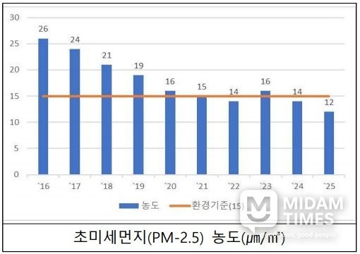 시는 그간 노후경유차 조기폐차, 친환경 자동차 보급, 사물인터넷 측정기기 부착 등 미세먼지 저감사업을 지속적으로 추진해 왔으며, 그 결과 2025년 초미세먼지 연평균 농도가 12㎍/㎥으로 2015년 26㎍/㎥ 대비 절반 이하 수준으로 개선됐다.