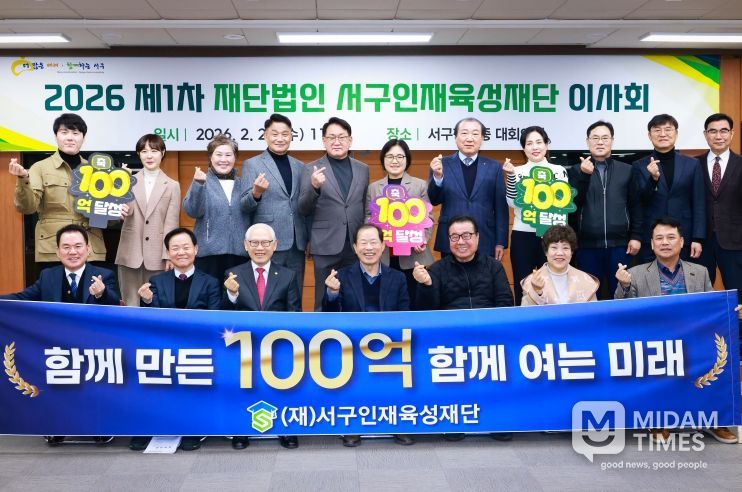 미담타임스 전해찬 기자 | 재단법인 서구인재육성재단은 2026년 2월 25일 오전 11시 서구청 3층 대회의실에서 ‘2026년 제1차 이사회’를 개최하고 기본재산 100억 원 달성을 축하하는 기념 촬영을 진행했다.