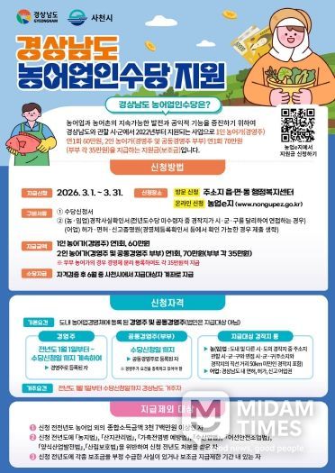 미담타임스 황명수 기자 | 사천시터는 경상남도 농어업인수당 지원 사업 신청 접수를 오는 3월 1일부터 3월 31일까지 진행한다고 27일 밝혔다.