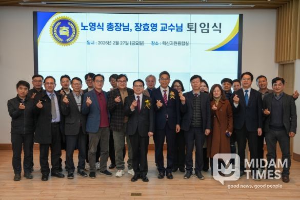 이날 퇴임식은 주요 약력 소개, 기념영상 상영, 감사패 및 꽃다발 증정, 퇴임사, 기념 촬영 순으로 진행됐다. 참석자들은 오랜 시간 대학과 지역을 위해 헌신해 온 두 사람의 명예로운 퇴임에 아낌없는 박수를 보냈다.