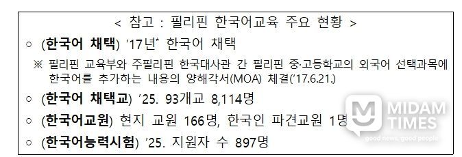 필리핀은 2017년에 현지 정규 교육과정의 외국어 과목으로 한국어를 정식 채택하는 것으로 결정하고, 2018년부터 한국어반을 운영해 왔다. 현재는 90여 개 학교에서 8,000여 명의 학생들이 한국어를 배우고 있다. 이번 양해각서는 한국 교육부가 필리핀 내 한국어 교사들을 위한 집중 연수 과정을 지원하여, 한국어교육 전문성을 높이도록 하는 내용이 핵심이다.