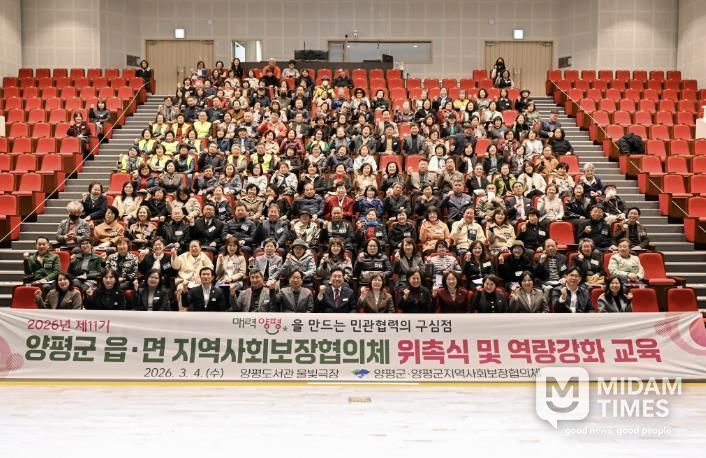 미담타임스 정주환 기자 | 양평군은 지난 4일 양평도서관 물빛극장에서 250여 명이 참석한 가운데 ‘2026년 제11기 읍면 지역사회보장협의체 위촉식 및 역량 강화 교육’을 개최하고, 지역 맞춤형 복지안전망 강화를 위한 본격적인 활동에 들어갔다고 밝혔다.