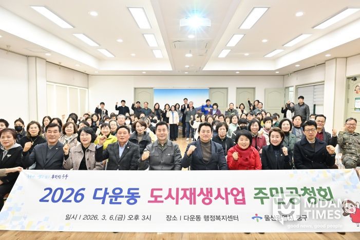 미담타임스 김준완 기자 | 울산 중구가 3월 6일 오후 3시 다운동 행정복지센터 2층 강당에서 ‘다운동 도시재생 활성화계획’ 변경 수립을 위한 주민공청회를 개최했다.