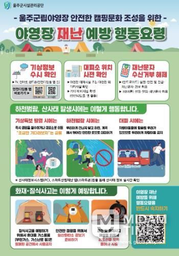 미담타임스 김준완 기자 | 울주군시설관리공단 울주군립야영장은 예측이 어려운 기상상황에 대비해 야영장 이용객의 신속한 대피를 돕기 위한 행동요령 홍보물 4천 부를 제작해 야영장 등에 배포했다고 9일 밝혔다.