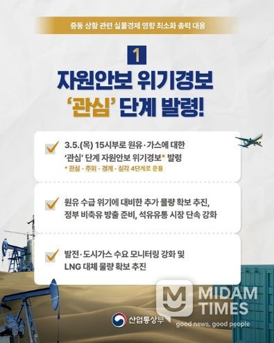 - 3.5.(목) 15시부로 원유·가스에 대한 '관심' 단계 자원안보 위기경보* 발령