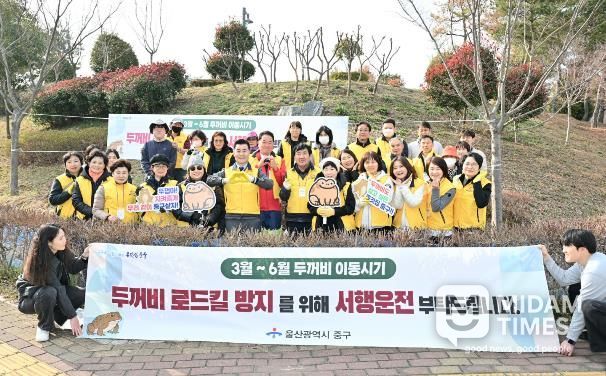 미담타임스 김준완 기자 | 울산 중구가 3월 10일 오후 1시 장현저류지 일대에서 민관합동 두꺼비 찻길 사고(로드킬) 방지 활동을 펼쳤다.