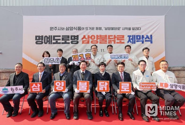 미담타임스 정인화 기자 | 원주시는 지난 11일 우산동 삼양식품 원주공장 인근에서 원주시 제1호 명예도로명인 ‘삼양불닭로’ 제막식을 열었다. 이날 행사에는 원강수 시장과 김정수 삼양식품 부회장, 김동찬 삼양식품 대표 등 관계자 30여 명이 참석했다.