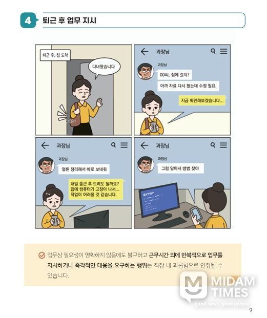 특히 △반복·과도한 지시 △휴가 사용 압박 △업무 편중 △퇴근 후 SNS 업무 지시 △공개적 질책 등 직원들이 실제 업무 환경에서 공감할 수 있는 사례들을 4컷 만화로 풀어내 직원들의 이해도를 높였다.