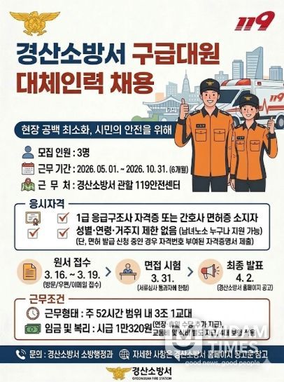 미담타임스 김준완 기자 | 경산소방서가 구급현장 공백을 최소화하기 위해 구급대원 대체인력 채용에 나선다.