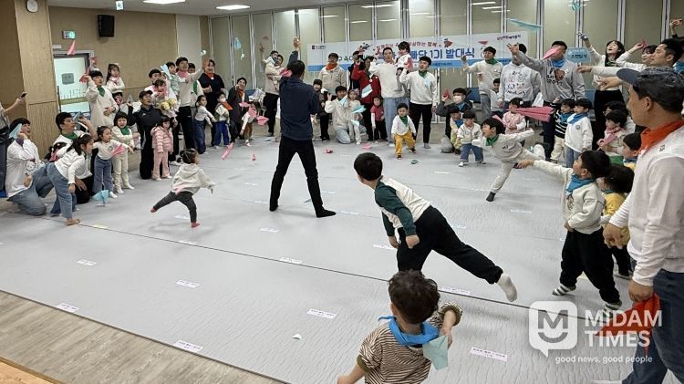 이어진 2부 행사에서는 아빠와 자녀가 함께하는 ‘스킨십 레크리에이션’ 프로그램이 진행됐다. 참가 가족들은 함께 몸을 움직이며 즐거운 시간을 보내고 서로 교류하며 ‘육아 동지’로서 첫 만남을 가졌다.