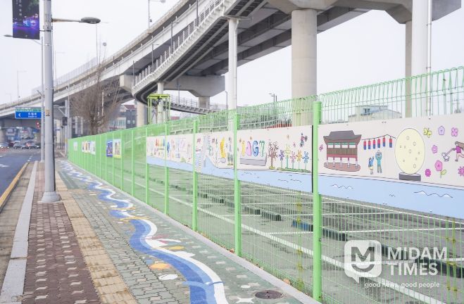 주요 사업 내용으로, 계양아라온 북단에서 황어장터 역사문화센터까지 이어지는 보행 구간에 ‘바닥 유도선’을 설치했다. 구간 내 노후한 주차장 펜스에 ‘계양의 사계’를 주제로 한 디자인 벽화를 조성하여 보행 환경을 조성했다.