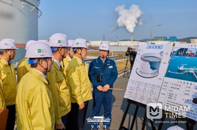 미담타임스 공한별 기자 | 이재명 대통령은 오늘 오후 충남 서산시 대산읍에 위치한 한국석유공사 서산비축기지를 방문해 비축유 관리 상황을 점검하고 주요 석유화학기업들과 현장 간담회를 가졌다.
