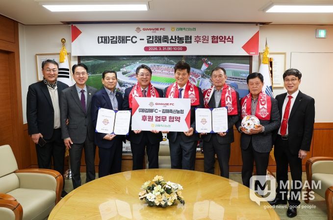 미담타임스 황명수 기자 | 김해FC가 김해축협과 손을 잡고 2026시즌의 힘찬 레이스를 시작한다. 김해FC는 31일 오전 10시 김해시청에서 구단주 홍태용 김해시장과 김해축협 송태영 조합장이 참석한 가운데 공식 후원 협약식을 개최했다.