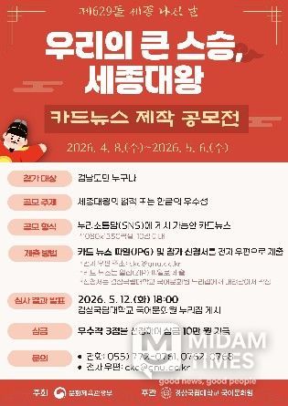 미담타임스 황명수 기자 | 경상국립대학교 국어문화원은 제629돌 세종 나신 날(5월 15일)을 기념하여 ‘우리의 큰 스승, 세종대왕 카드뉴스 제작 공모전’을 개최한다.