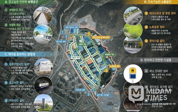 주요 사업 내용은 ▲노후도로 정비 ▲보행 친화형 보도 정비 ▲가로수 정비 ▲안내판 정비 ▲근로자 편의시설 조성 등으로 기반시설 정비뿐 아니라 경관·안전·휴식 기능을 고루 갖춘 산업단지로 탈바꿈시키겠다는 계획이다.