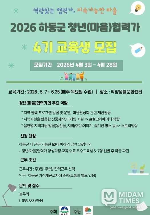 미담타임스 황명수 기자 | 하동군은 지역 활력 회복과 청년 일자리 창출을 위해 추진 중인 ‘청년(마을)협력가 양성과정’의 제4기 교육생을 오는 4월 28일까지 모집한다고 밝혔다.