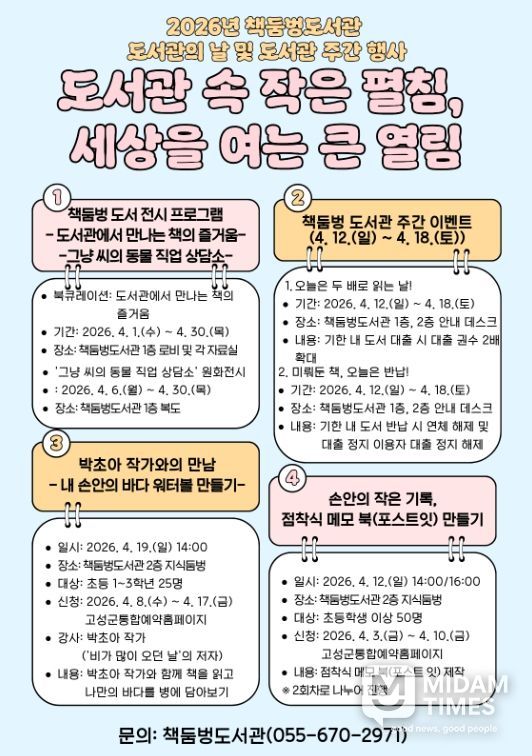 미담타임스 황명수 기자 | 책둠벙도서관은 제62회 도서관 주간을 맞아 지역 주민의 독서 문화 활성화와 도서관 이용 증진을 위해 다양한 행사를 운영한다.