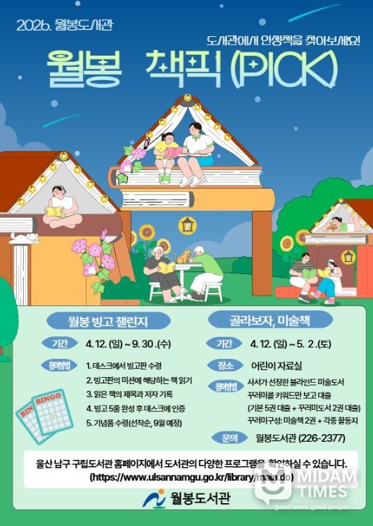 미담타임스 김준완 기자 | 울산 남구 월봉도서관은 지역 주민들의 독서 의욕을 고취하고 도서관 이용을 활성화하기 위해 오는 12일부터 9월30일까지 맞춤형 독서 프로그램인 ‘월봉 책픽’(PICK)을 운영한다고 9일 밝혔다.