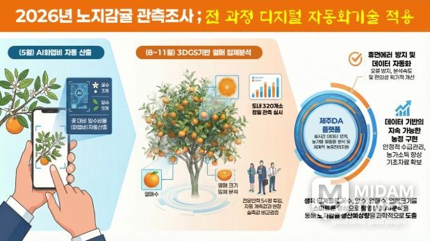 김태우 농업디지털센터장은 “노지감귤 관측조사에 자동화 기술을 적용하는 것은 조사 과정의 오류를 줄이고 데이터 도출의 속도와 편의성을 높이는 의미 있는 진전”이라며 “올해는 실측값과의 철저한 비교 검증을 거쳐 영농 현장에서 신뢰받는 관측 시스템으로 안착시키겠다”고 말했다.