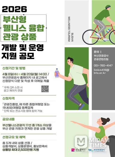 미담타임스 남혜영 기자 | 부산시와 부산관광공사는 부산 웰니스 관광자원을 활용한 융합 관광상품 개발과 글로벌 시장 진출을 지원하기 위해 '부산형 웰니스 융합 관광상품 개발 및 운영 지원' 공모를 오는 4월 20일까지 실시한다고 밝혔다.