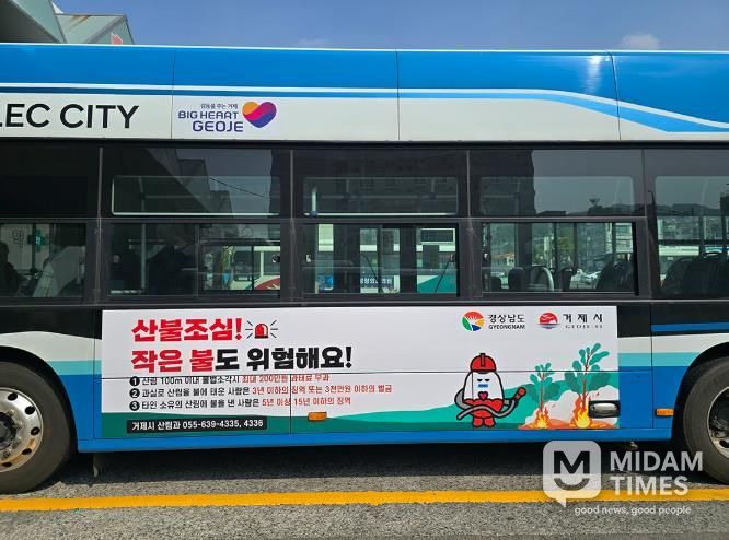 미담타임스 황명수 기자 | 거제시는 봄철 산불 발생 위험이 증가함에 따라 시민들의 산불 예방 인식 제고를 위해 시내버스를 활용한 산불예방 랩핑 광고 사업을 시행하고 있다고 밝혔다.
