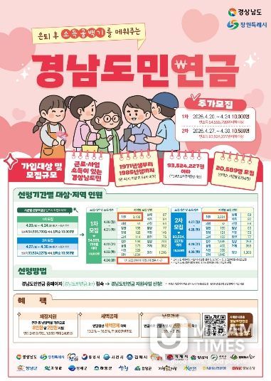 미담타임스 황명수 기자 | 창원특례시는 은퇴 후 국민연금 수령 전까지 소득공백기 대비와 노후준비 지원을 위해 지난 1월 ‘경남도민연금’ 가입자 모집에 이어 4월 추가모집을 시행한다고 밝혔다.