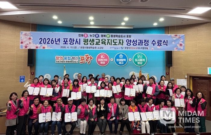 미담타임스 김준완 기자 | 포항시는 지난 10일 평생학습원 소강당에서 수료생 44명을 대상으로 ‘2026년 포항시 평생교육지도자 양성과정’ 수료식을 가졌다.