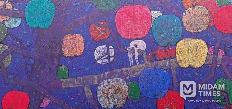 화면 속 채색은 사과의 외형을 재현하기보다 그 안에 응축된 기운을 드러내며, 존재의 본질에 대한 사유를 회화적 장으로 펼쳐낸다.