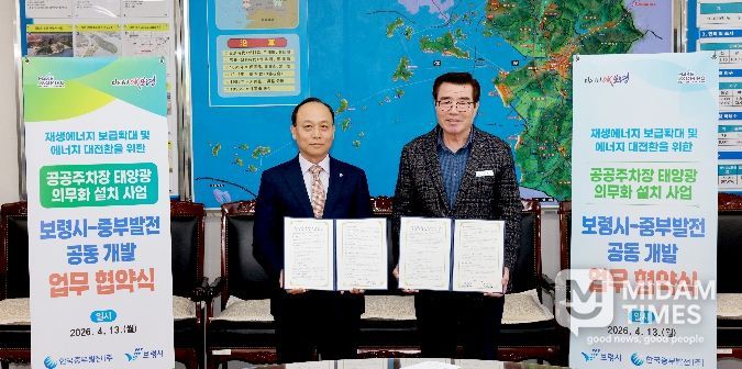 미담타임스 정인화 기자 | 보령시는 지난 13일 보령시청 시장실에서 한국중부발전과 ‘공공주차장 태양광 의무화 설치사업’ 공동개발을 위한 업무협약(MOU)을 체결했다고 밝혔다.
