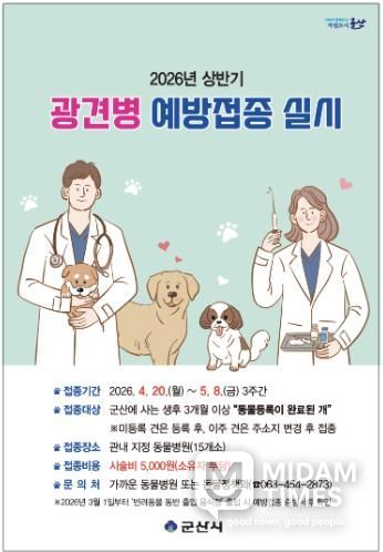 미담타임스 김준완 기자 | 군산시는 4월 20일부터 5월 8일까지 3주간 관내 동물병원 15개소에서 상반기 광견병 예방접종을 실시한다고 밝혔다.
