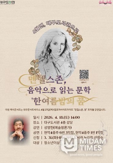 미담타임스 전해찬 기자 | 대구도서관은 4월 도서관 주간을 맞아 대구콘서트하우스와 협업해 특별 렉처콘서트 ‘멘델스존 음악으로 읽는 문학’을 4월 18일 오후 2시에 개최한다.