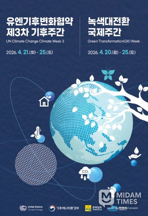 미담타임스 김준완 기자 | 전라남도는 20~25일 여수세계박람회장 일원에서 ‘제3차 유엔기후변화협약 기후주간(UNFCCC Climate Week 3 Yeosu) 및 녹색대전환 국제주간(GX-Week)’을 개최, 글로벌 기후외교 무대를 밟는다고 밝혔다.