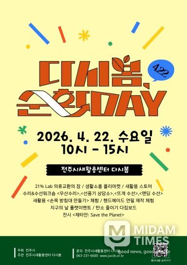 미담타임스 김준완 기자 | 전주시새활용센터 ‘다시봄’은 오는 22일 ‘지구의 날’을 맞아 의류 폐기물을 줄이고 자원 순환의 가치를 공유하는 ‘다시봄 순환 Day 4.22’ 행사를 개최한다.