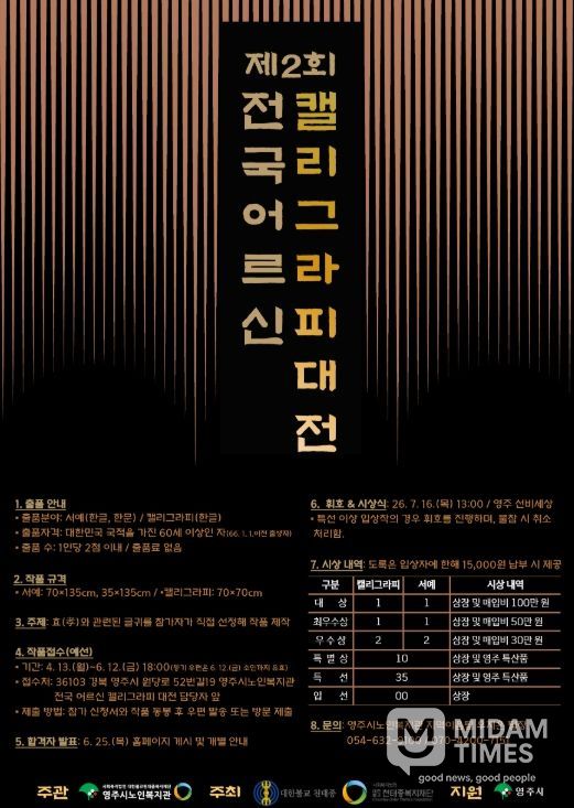 미담타임스 김준완 기자 | 천태종복지재단 산하 영주시노인복지관은 어르신들의 문화예술 참여 기회를 확대하고 창작 활동을 지원하기 위해 '제2회 전국 어르신 캘리그라피 대전'을 개최한다.