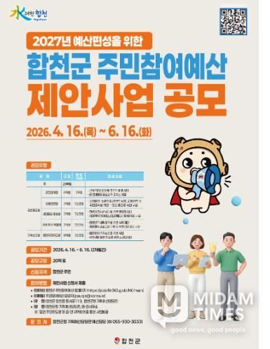 미담타임스 황명수 기자 | 합천군은 2027년도 예산편성을 위한 주민참여예산 제안사업 공모를 6월 16일까지 실시하며, 올해부터 공모 분야를 기존 1개 모델 3개 유형에서 3개 모델 5개 유형으로 확대 개편한다고 밝혔다.