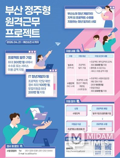 미담타임스 남혜영 기자 | 부산시는 지역 청년 아이티(IT) 인력이 부산에 거주하면서 국내외 기업의 프로젝트를 수행할 수 있도록 지원하는 '부산형 마이크로 일자리 기반 정주형 원격근무 프로젝트' 사업을 전국 최초로 올해 시범 추진한다고 밝혔다.