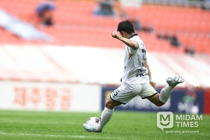 경기 초반 흐름은 김천상무가 주도했다. 전방에서부터 강력한 압박을 통해 제주를 거세게 몰아부쳤다. 제주도 이를 공략하기 위해 빠른 빌드업을 시도하며 대응했다. 전반 24분, 위기가 찾아왔다. 오른쪽에서 공격을 시도한 제주가 크로스를 올렸고, 골키퍼와 수비 사이로 크로스가 향했다. 상대 공격수가 이를 슈팅으로 연결했지만, 백종범이 끝까지 몸을 날려 팀을 위기에서 구해냈다.