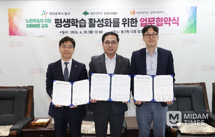 미담타임스 조혜리 기자 | 대전 동구는 20일 대전대학교 RISE사업단‧대전시치매센터와 ‘느린학습자 평생교육 지원’과 ‘치매예방 프로그램 운영’을 위한 업무협약을 체결했다고 밝혔다.