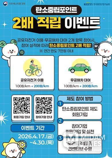 이벤트 기간은 4.17. ~ 4.30.까지 14일간이며, 해당기간에는 탄소중립포인트를 기존 100원/km에서 200원/km으로 2배 받을 수 있다. 다만 1인당 받을 수 있는 연간 7만원 한도는 변함이 없다.