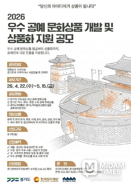 미담타임스 정주환 기자 | 한국도자재단이 ‘2026 공예 문화상품 개발 및 상품화 지원 사업’을 본격 추진한다고 22일 밝혔다.