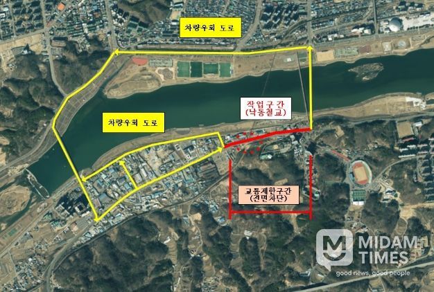 미담타임스 김준완 기자 | 안동시는 도시 기반시설 확충과 교통 흐름 개선을 위해 추진 중인 ‘수상대로 도로 확장공사’ 구간 내 폐선된 구)중앙선 철교 철거 작업에 따라, 오는 23일과 24일 일부 시간대에 ‘영호대교 남단사거리 ~ 안동새한자동차학원’구간의 차량 통행을 제한하고 우회를 안내한다고 밝혔다.