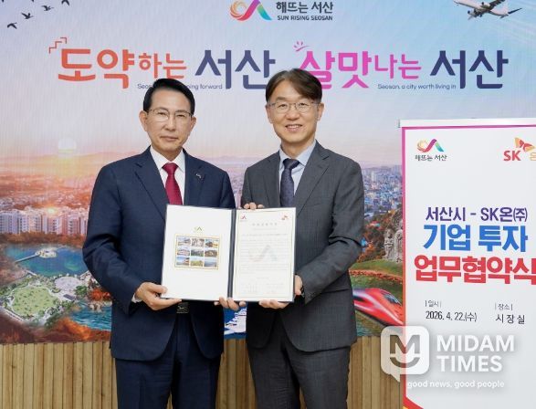 시는 22일 시청 시장실에서 이완섭 서산시장, 피승호 SK온㈜ 총괄 부사장이 참석한 가운데 협약식을 개최했다.