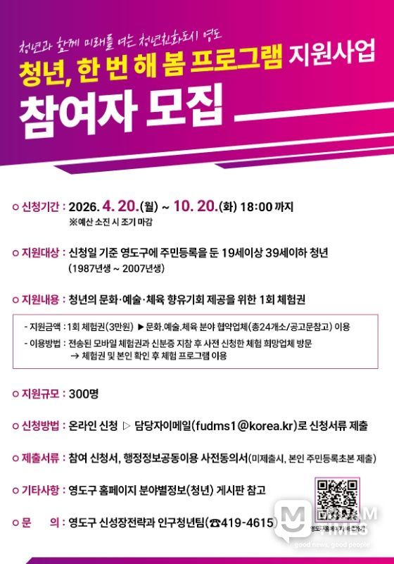 미담타임스 남혜영 기자 | 부산 영도구는 청년들에게 문화 향유 기회를 제공하고 지역 청년문화 활성화를 도모하기 위해 '청년, 한 번 해 봄 프로그램 지원사업' 참여자를 이달 20일부터 10월 20일까지 모집한다고 밝혔다.