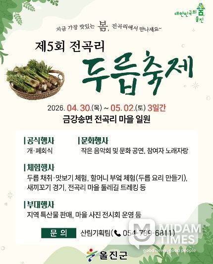 미담타임스 김준완 기자 | 울진군 금강송면 전곡리에서 봄철 대표 산나물인 두릅을 주제로 한 ‘제5회 전곡리 두릅축제’가 오는 4월 30일부터 5월 2일까지 3일간 전곡리 마을 일원에서 개최한다.